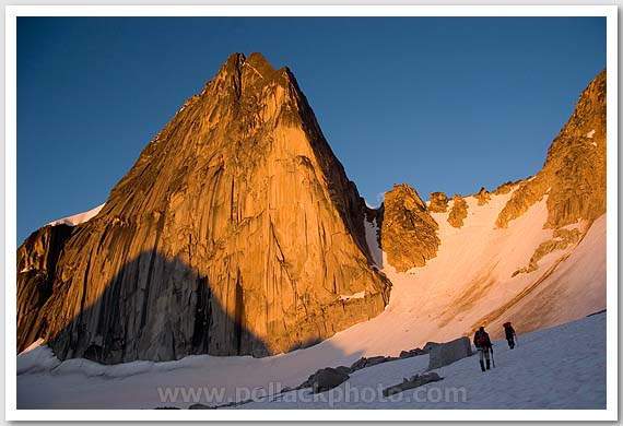 Sunrise on Snowpatch Spire with climbers below, Bugaboo Glacier Provincial Park, Canada