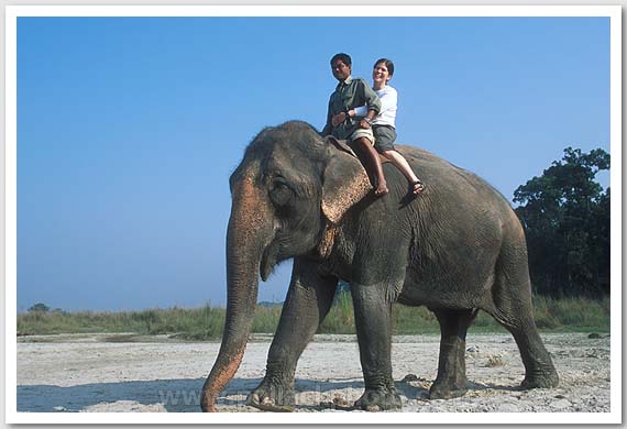 Anna Alonzo and an elephant driver riding bareback, Royal Chitwan National Park, Nepal