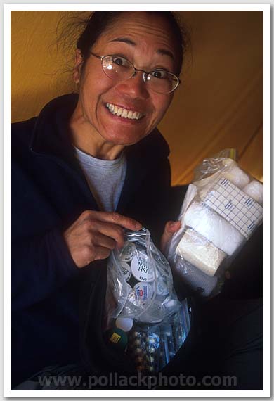 Jackie Garces dipping into the first aid supplies, Khumbu region, Nepal