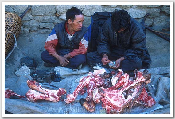 Butchers counting the receipts at the Saturday market, Namche Bazaar, Nepal