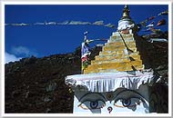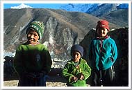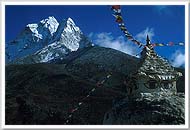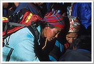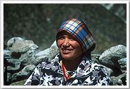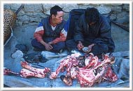 The predominant people living in the Khumbu region are the Sherpas. (The term "sherpa" with a small "s" is also used to describe a job, namely assisting a trek or climb as a porter, guide, or other similar position.) These images show some of the Sherpa people who live in the mountain villages along our trek, as well as commerce at one of the major markets, and aspects of the Buddhist spiritual life. |