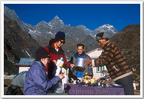 Anna Alonzo, Jackie Garces, and Alvin Goo enjoying a trekking breakfast served by Yula, Khumbu region, Nepal