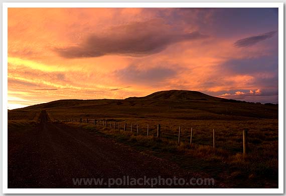 Sunset on a farm road, Otago Peninsula, New Zealand