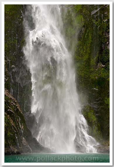 Waterfall pouring into Milford Sound, Fiordland National Park, New Zealand