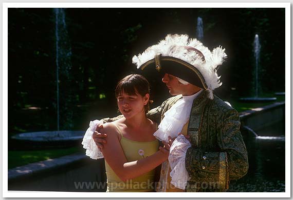 Tourist posing for a photo with an actor in period garb, Petrodvorets, Russia