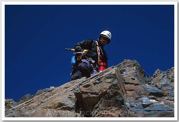 Doug Hagen passing a rock band, Condoriri Group, Bolivia