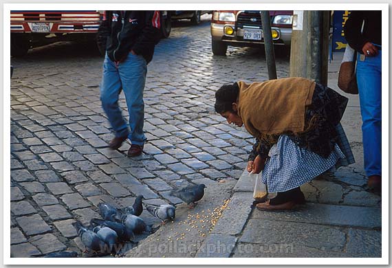 Woman feeding pigeons, La Paz, Bolivia