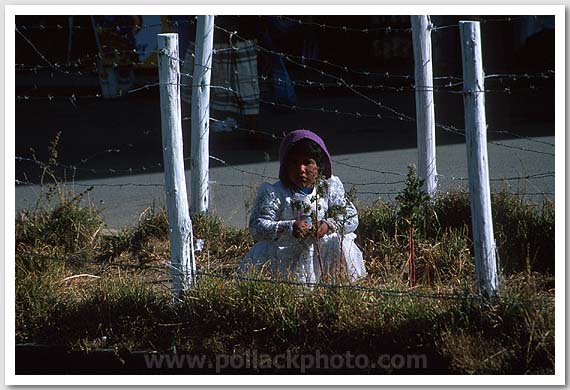 Girl in white, hemmed in by a barbed wire fence
