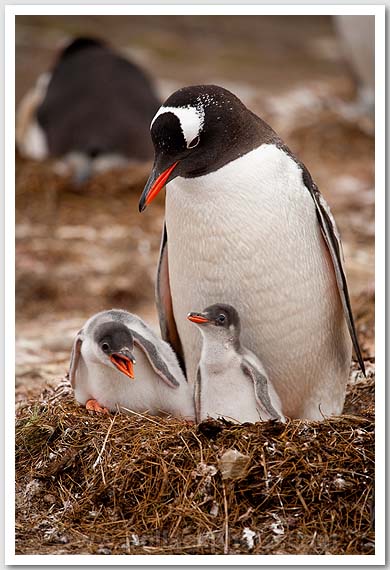 Gentoo adult and chicks, South Georgia