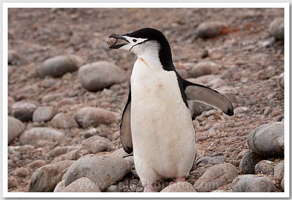 Chinstrap penguin carrying a pebble, Greenwich Island, South Shetlands