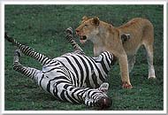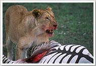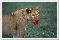 We arrived at this scene just moments after the lioness had brought down a zebra. Watching it feed was a gruesome, powerful experience. Later, other lions showed up and got their turn to eat too. The hyenas, vultures, and other animals were kept at bay; when it's meal time in the Serengeti, it appears that the lions are king. |
