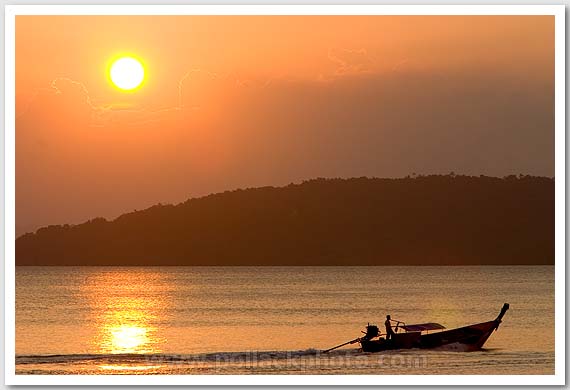 Longtail boat returning home at sunset, Ao Nang Beach, Thailand
