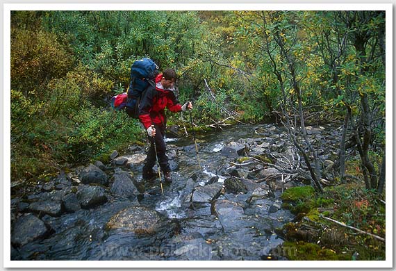 Sandy Weil crossing a creek among the willows, Denali National Park, AK