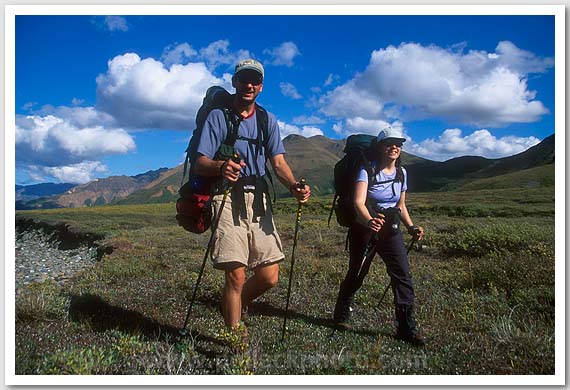 Steve Matera and Anna Alonzo hiking up the Toklat River valley, Denali National Park, AK