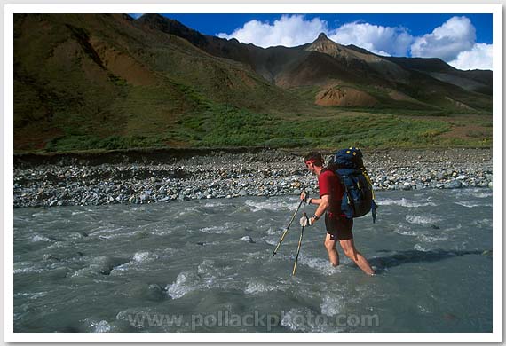 Sandy Weil fording the Toklat River, Denali National Park, AK