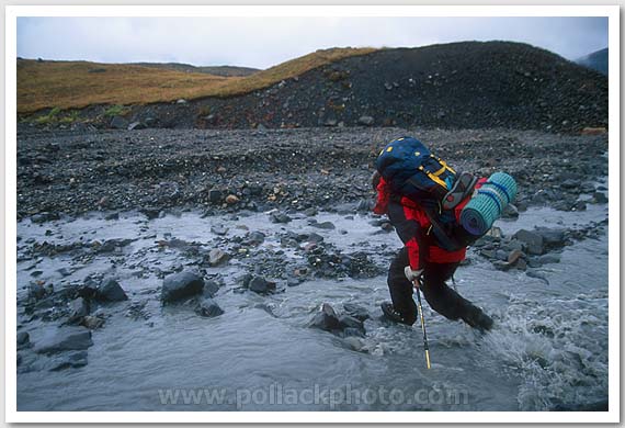 Sandy Weil rock-hopping across Glacier Creek, Denali National Park, AK