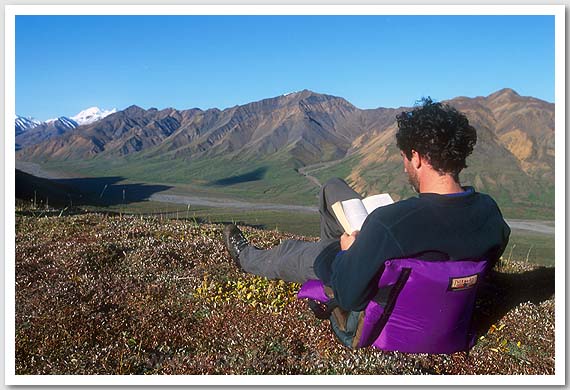 Ethan Pollack sitting and reading with Denali views, Denali National Park, AK