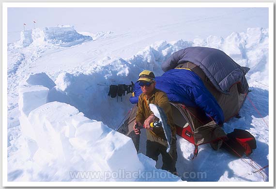 Carla Schauble doing some home maintainence, Kahiltna Glacier, Denali National Park, AK