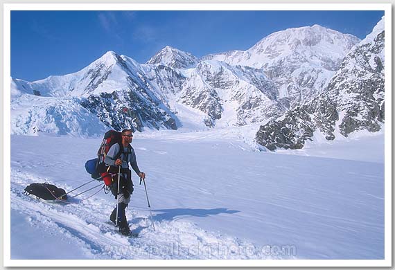 Rob Duff on the Kahiltna Glacier with Denali beyond, Denali National Park, AK