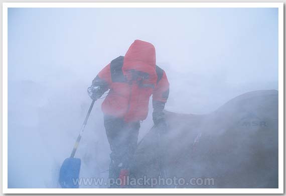 Doxey Kemp digging out the tent in a raging snow storm, Denali National Park, AK