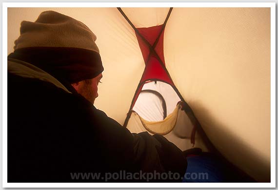 Rob Duff tent-bound in a storm, Denali National Park, AK