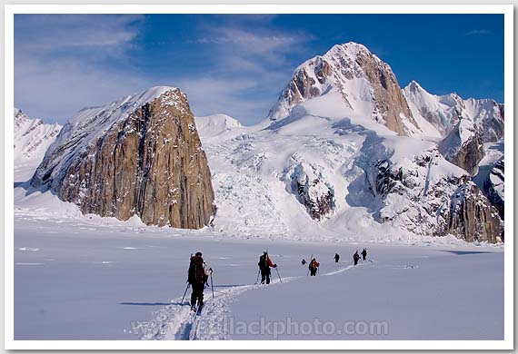 Ski touring below the Moose's Tooth, Denali National Park, AK