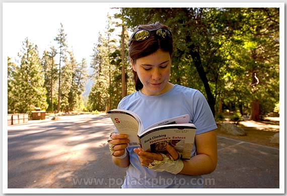 Anna Alonzo consulting the climbing guidebook, Yosemite National Park, CA