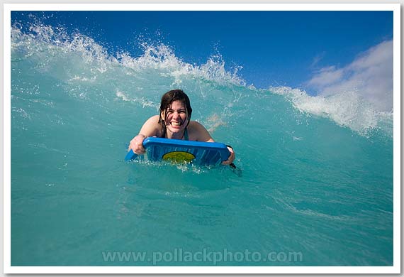 Anna Alonzo boogie boarding a big wave, Kauai, Hawaii