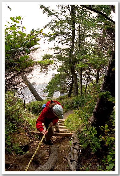 Anna Alonzo on one of ladders of the Third Beach trail, Olympic National Park, WA