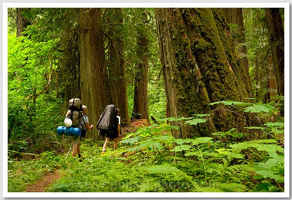 Backpacking past the huge cedars of the Big Beaver Trail, North Cascades National Park, WA