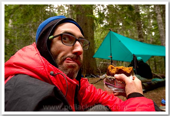 Ethan Pollack enjoying his rations, Beaver Pass camp, North Cascades National Park, WA