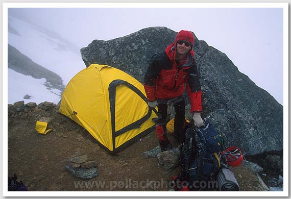 The storm begins, Sandy Weil at the Dome Glacier - Chickamin Glacier Col, Glacier Peak Wilderness, WA