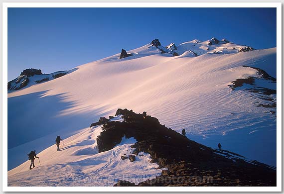 Climbing at sunrise onto the Ptarmigan Glacier, Glacier Peak, Glacier Peak Wilderness, WA