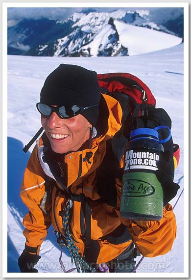 Carla Schauble and her well-stickered water bottle, Glacier Peak, Glacier Peak Wilderness, WA