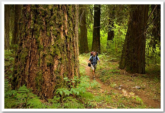 Steve Matera hiking among the giant trees of the Big Beaver Trail, North Cascades National Park, WA