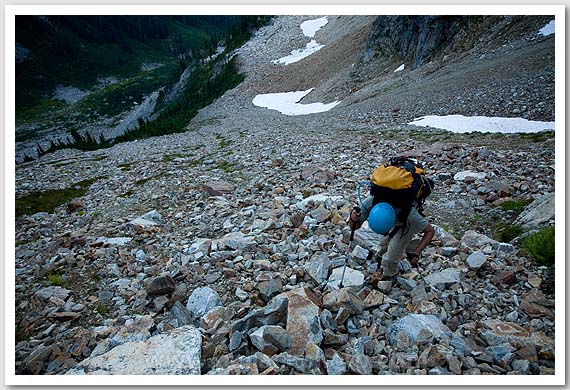 Shail Srinivas climbing out of the Access Creek basin, North Cascades National Park, WA