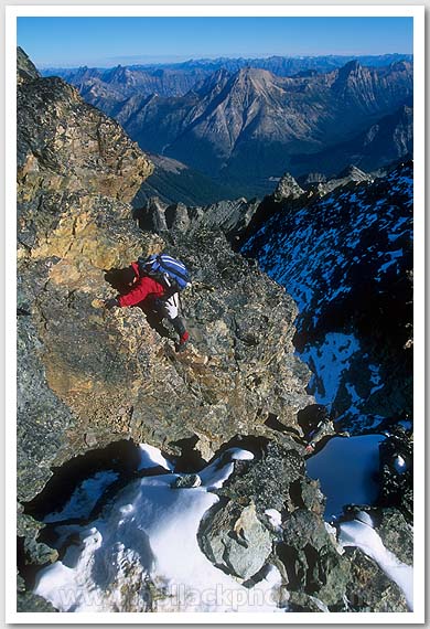 Phil Schimke downclimbing the summit block on Black Peak, North Cascades National Park, WA