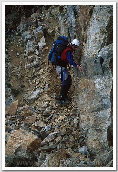 Phil Schimke skirting along a cliff band, Mt. Fury, North Cascades National Park, WA