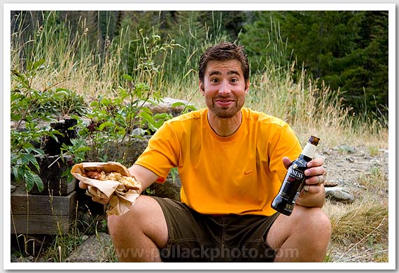 Matt Blakeney, trailhead celebration after a climb of Mt. Stuart, Cascades, WA