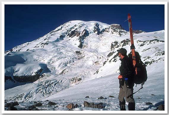 Doug Hagen, skis on his pack, looking at the summit, Mt. Rainier National Park, WA