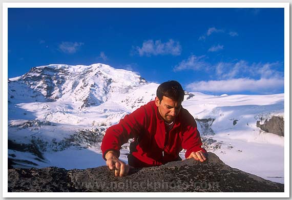 Steve Matera topping out on a boulder, Mt. Rainier National Park, WA