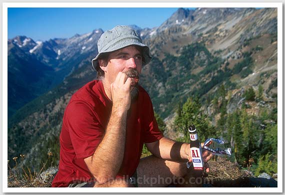 David Pippin enjoying a meaty summit treat, Carne Mountain, Glacier Peak Wilderness, WA
