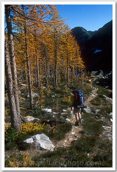 Phil Schimke backpacking among autumn larches, Wing Lake trail, North Cascades, WA