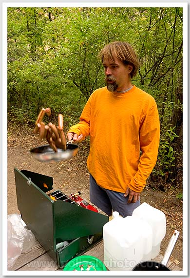 David Pippin fixin' up breakfast sausages, Tieton, WA