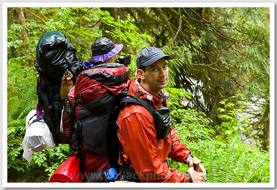 Steve Matera and Shauna McDanial on a rainy backpack, Boulder River Wilderness, WA