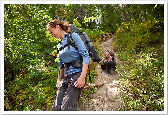 Mia Pollack, Megan Scott, and Anna Alonzo on a steep trail descent, Ingalls Creek, Cascades, WA