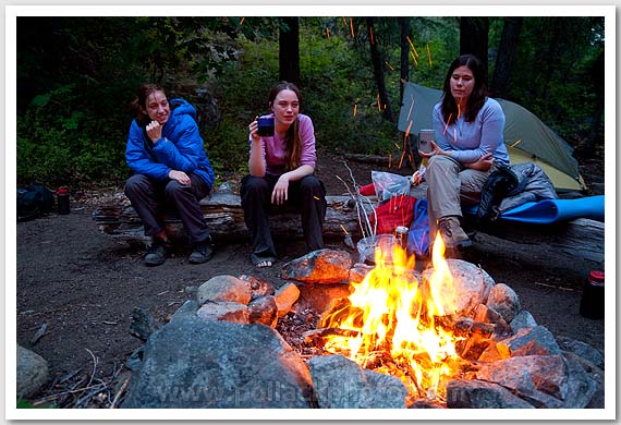 Mia Pollack, Megan Scott, and Anna Alonzo by the campfire, Ingalls Creek, Cascades, WA