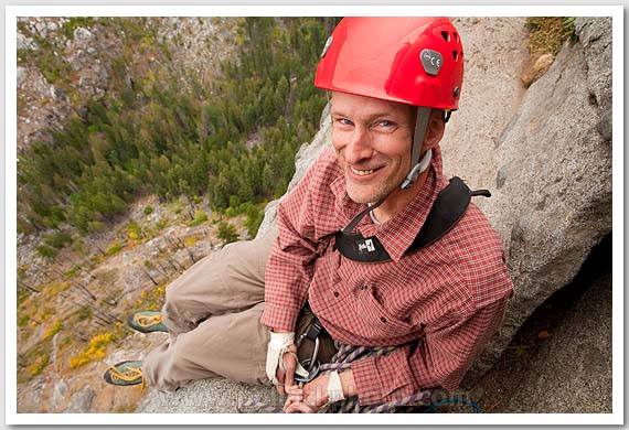 Doxey Kemp at a belay on Snow Creek Wall, Cascades, WA