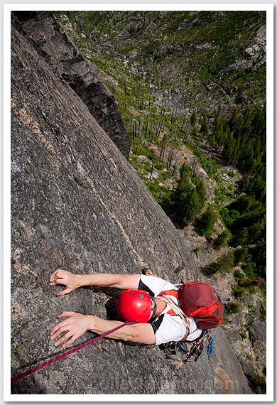 Sandy Weil high on 'Orbit', Snow Creek Wall, Leavenworth, WA