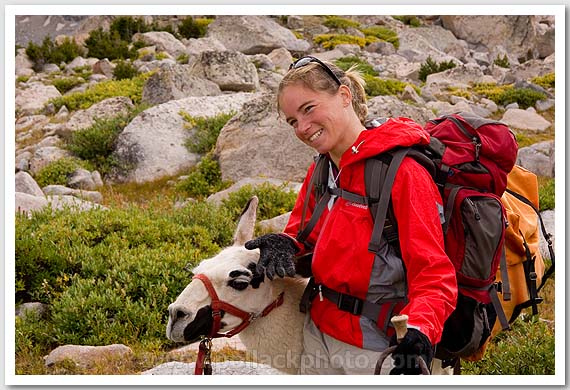 Jane Matera with hairy llama, Wind River Range, WY